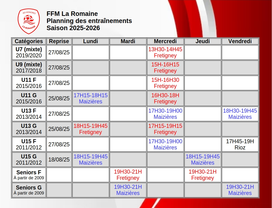 La nouvelle saison démarre, et voici les créneaux d’entraînements pour l’ensemble de nos équipes. Nous avons hâte de retrouver nos licenciés sur le terrain et de partager une belle année de football ensemble !